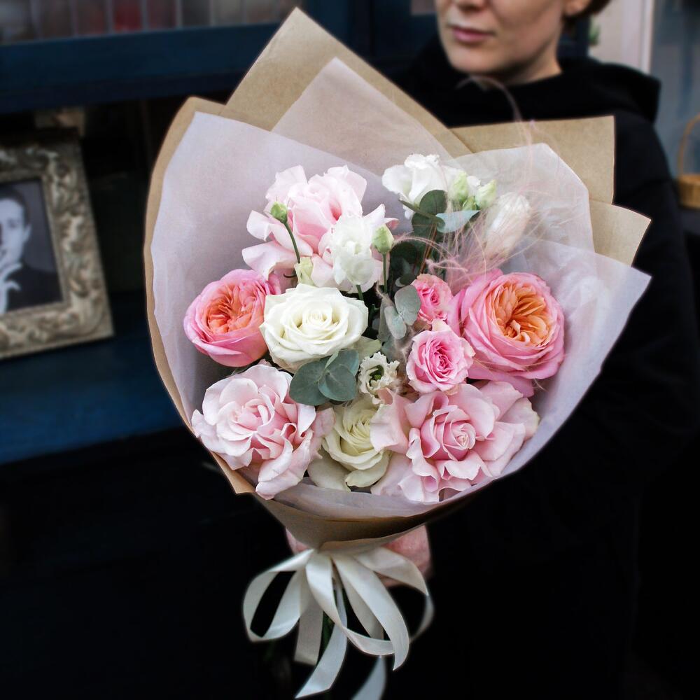 Авторский букет из французских и пионовидных роз с эвкалиптом