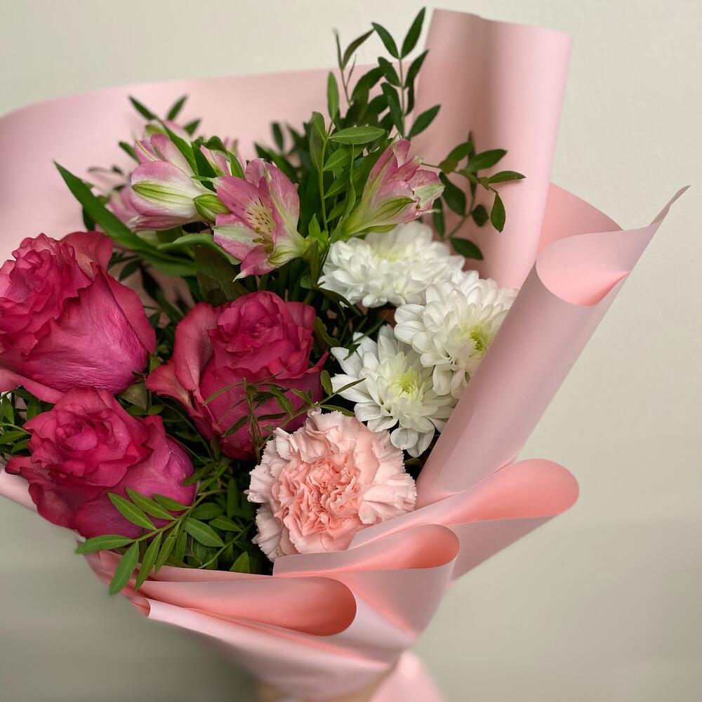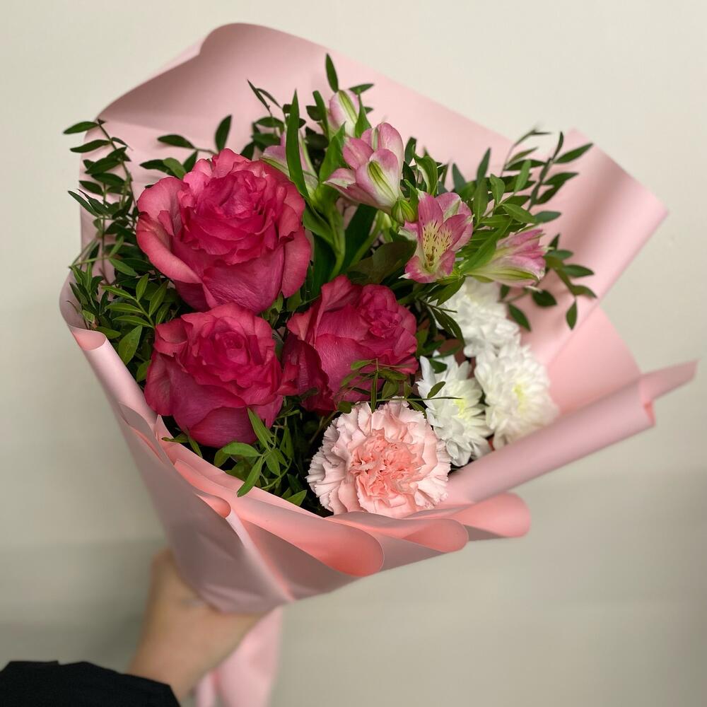Альстромерия – 1 шт.Хризантема кустовая – 1 шт.Роза – 3 шт.Зелень – 3 шт.Упаковка – 3 шт.Гвоздика – 1 шт.