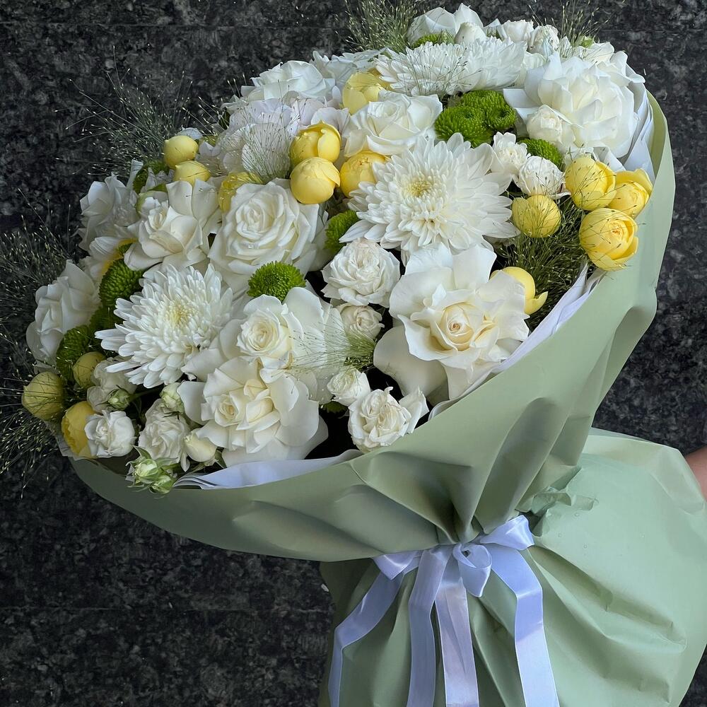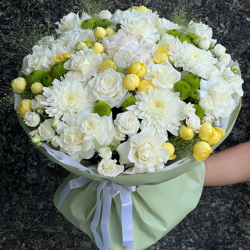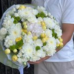 Букет из хризантемы Густав, маттиол, пионовидных роз