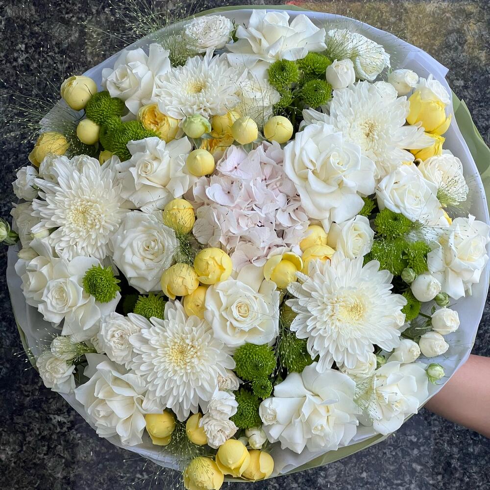 Гортензия – 1 шт. Роза – 13 шт. Спрей роза – 11 шт. Хризантема – 10 шт. Рускус – 5 шт. бумага дизайнерская – 1 шт.