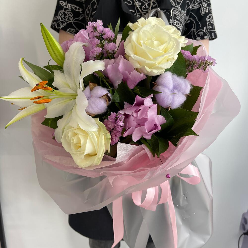 Лилия – 1 шт.Роза – 3 шт.Пион – 3 шт.Статица – 2 шт.Салал – 4 шт.Хлопок – 2 шт.