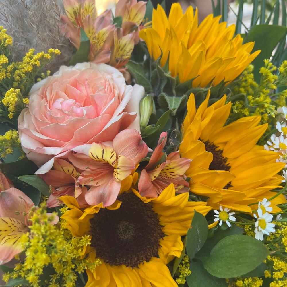 Категорий: Альстромерии, Пионовидные розы, Подсолнухи, Розы, Ромашки, Сухоцвет