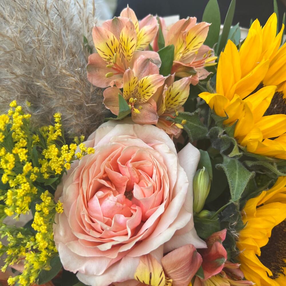 Подсолнух – 3 шт.Роза пионовидная – 1 шт.Альстромерия – 3 шт.Зелень – 3 шт.Монстера – 1 шт.Солидаго – 4 шт.Матрикария (Ромашка Камила) – 1 шт.Сухоцветы – 1 шт.Упаковка дизайнерская – 1 шт.