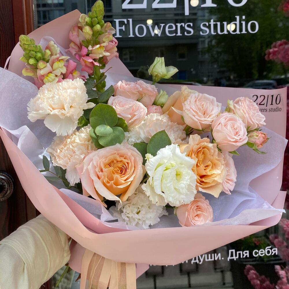 Лента атласная – 1 шт.Кустовая роза Бомбастик – 2 шт.Упаковка дизайнерская – 4 шт.Эвкалипт Микс – 3 шт.Роза шиммер – 3 шт.Диантус сортовой – 3 шт.антиринум – 2 шт.эустома алиса белая – 1 шт.