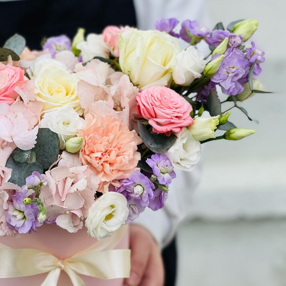 Гортензия – 1 шт.Маттиола – 2 шт.Эвкалипт – 3 шт.Гвоздика – 2 шт.Эустома – 2 шт.Лента атласная – 1 шт.Роза белая – 4 шт.Шляпная коробка – 1 шт.Бомбастик – 3 шт.Оазис флористический – 1 шт.