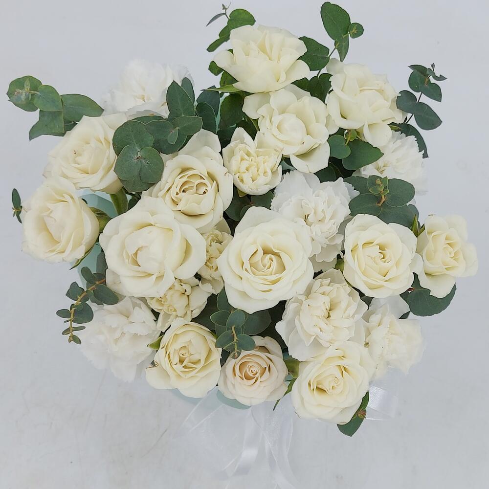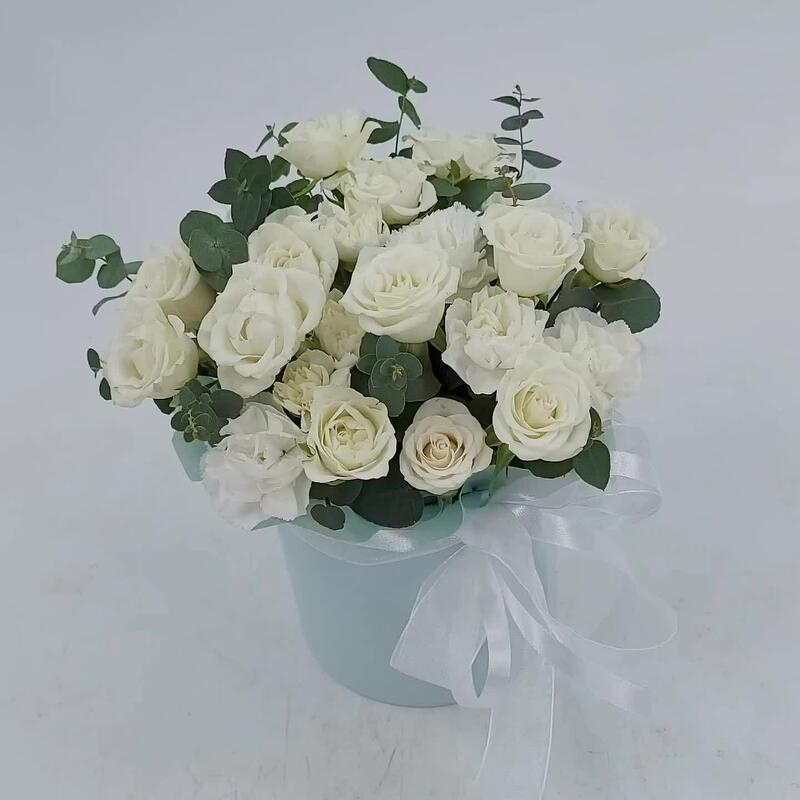 Белые кустовые розочки с эвкалиптом в коробке XS