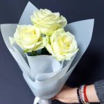 белые розы 50 см – 3 шт.Крафт упаковка – 1 шт.Лента атласная – 1 шт.