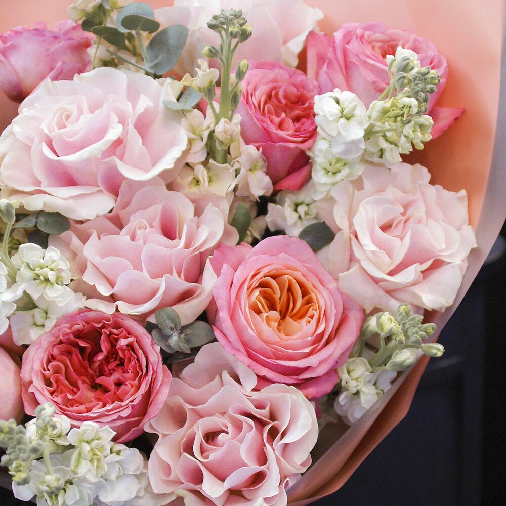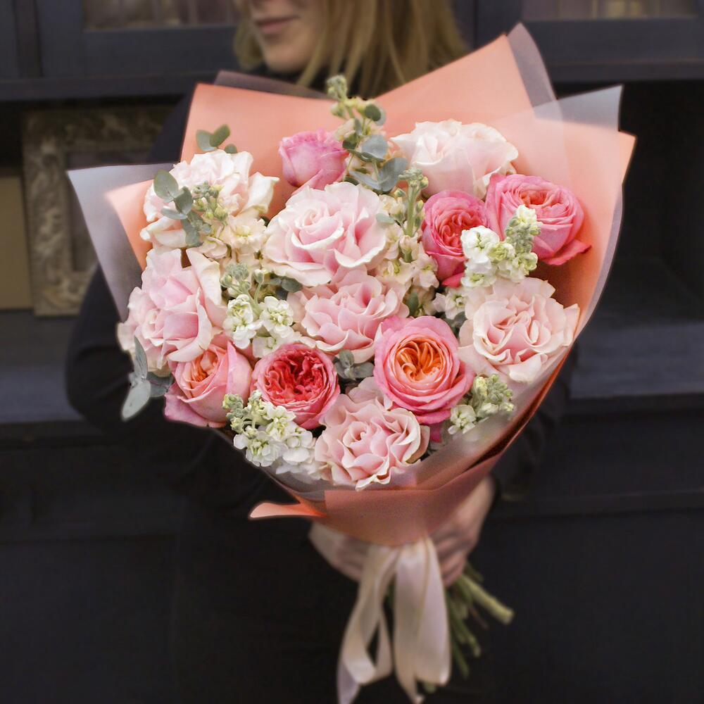 Большой авторский букет из французских и пионовидных роз с маттиолой с эвкалиптом