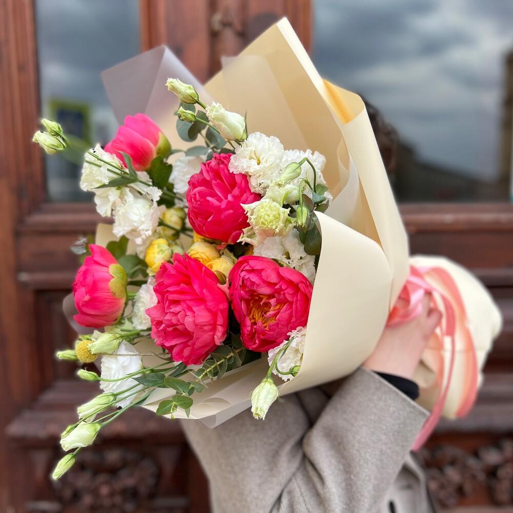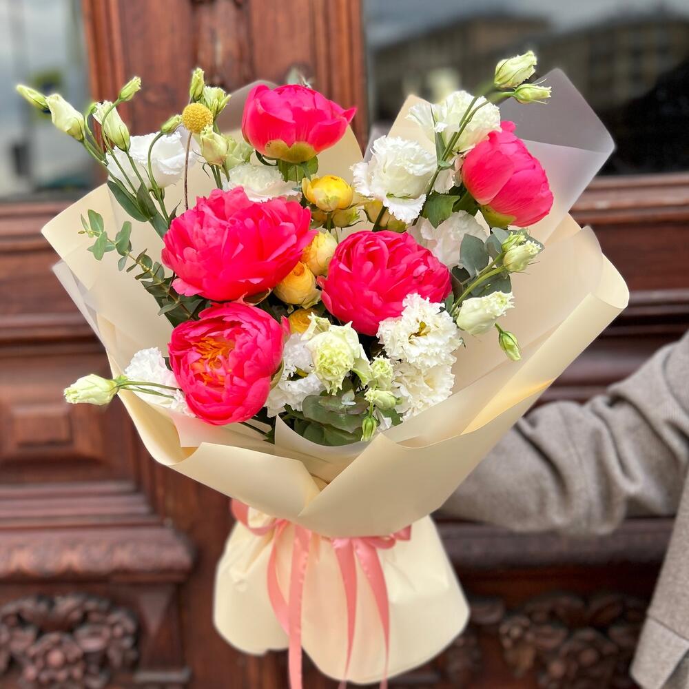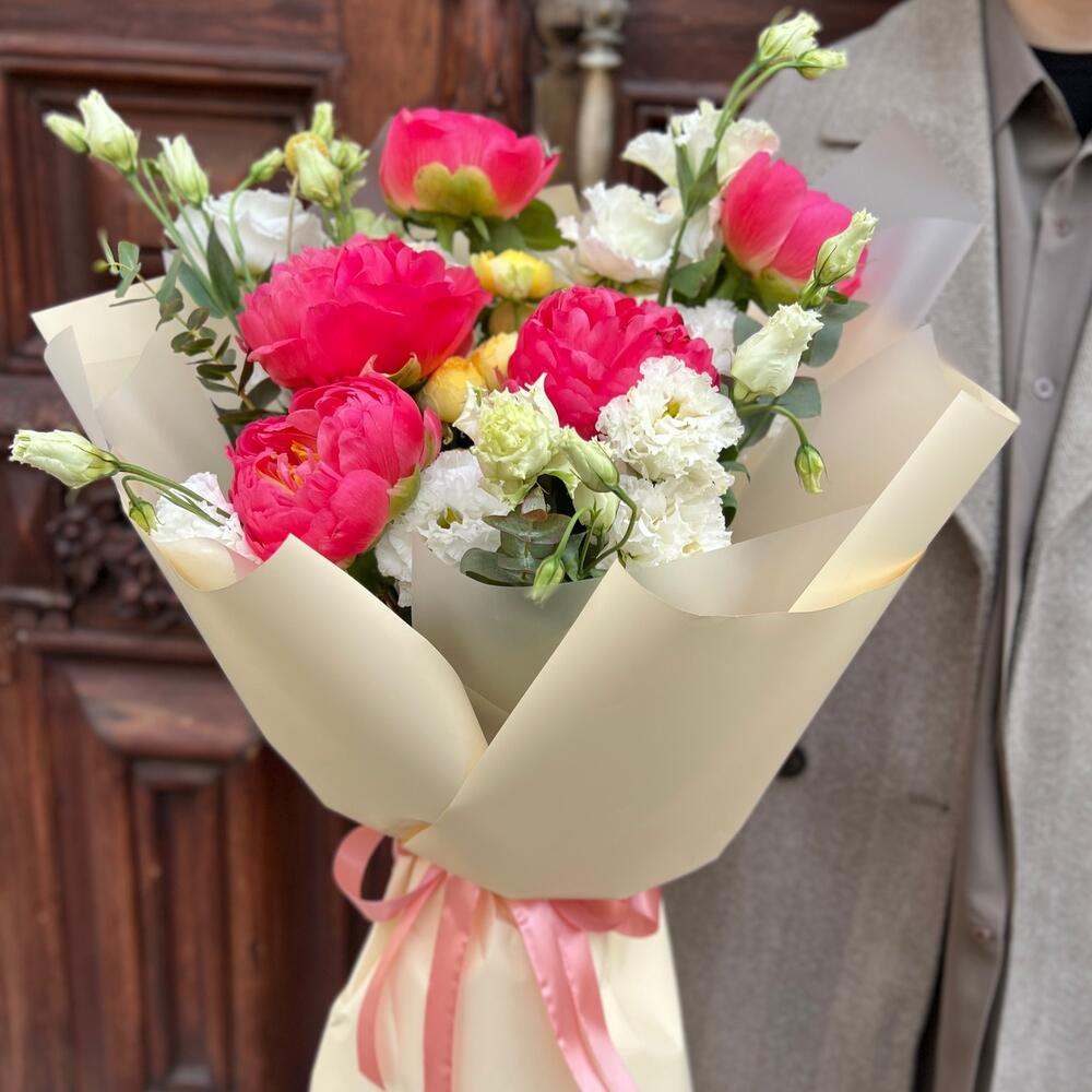 Краспедия – 1 шт.Эвкалипт – 3 шт.Лента атласная – 2 шт.Пленка матовая – 7 шт.Эустома белая махровая – 4 шт.Пион коралл шарм – 5 шт.роза пионовидная луна трендсеттер – 1 шт.