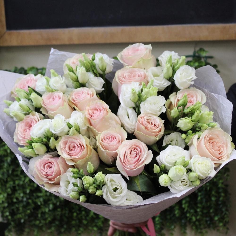 Лизиантус – 10 шт.Лента атласная – 2 шт.Крафт дизайнерский – 2 шт.роза фруттето – 15 шт.