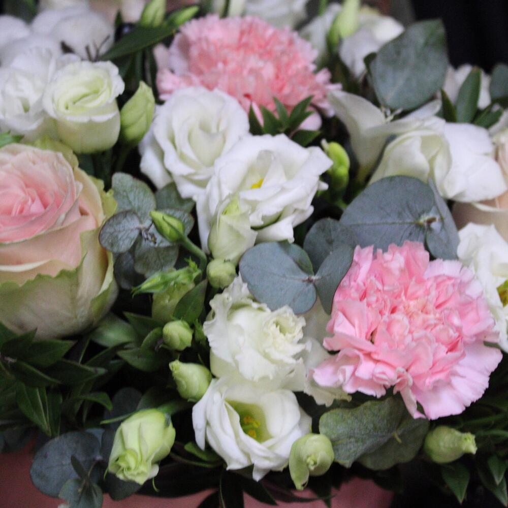 Роза Эквадор – 3 шт.Эустома – 5 шт.Хлопок натуральный – 2 шт.Фрезия белая – 3 шт.Диантус – 4 шт.Эвкалипт – 2 шт.Фисташка – 2 шт.Коробка шляпная – 1 шт.Оазис – 1 шт.