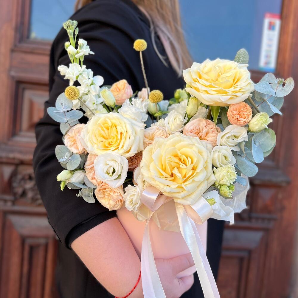 роза кэндллайт – 3 шт.роза кустовая пионовидная трендсеттер – 2 шт.Краспедия – 3 шт.эустома махровая белая – 1 шт.эустома розита вайт – 1 шт.Маттиола – 1 шт.Эвкалипт – 3 шт.Оазис флористический – 1 шт.Коробка шляпная – 1 шт.Лента атласная – 2 шт.
