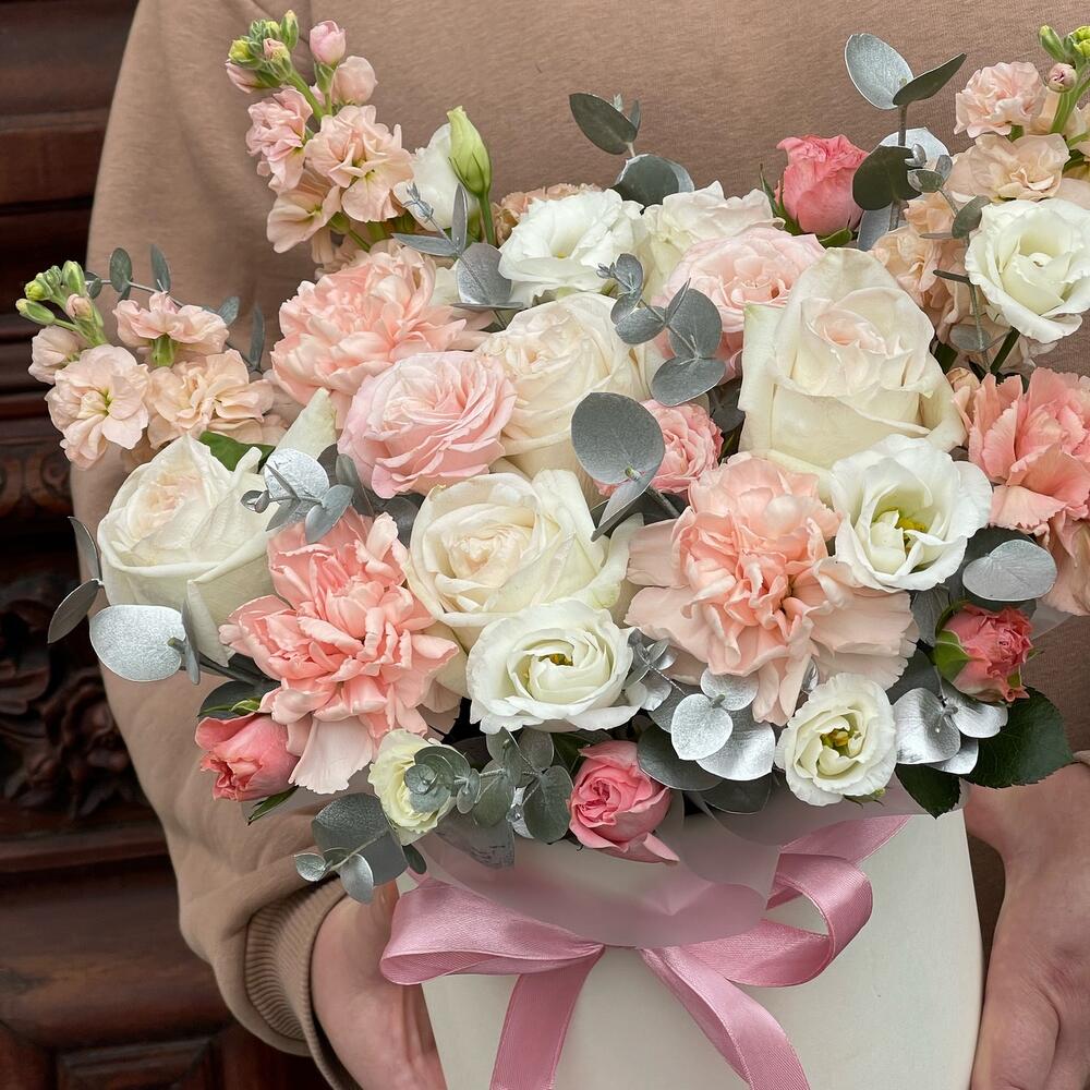 Маттиола – 3 шт.Эвкалипт – 1 шт.Эустома – 2 шт.Лента атласная – 1 шт.Диантус – 5 шт.Коробка шляпная – 1 шт.Роза кустовая пионовидная – 2 шт.Оазис флористический – 1 шт.роза пионовидная white o’hara – 5 шт.