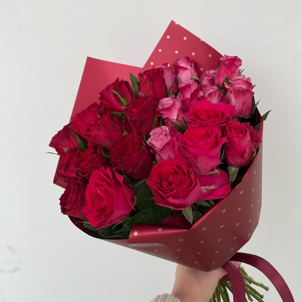 Упаковка – 1 шт.Лента атласная – 1 шт.роза кения – 25 шт.хризал для срезанных цветов – 1 шт.мини открытка на выбор по запросу – 1 шт.