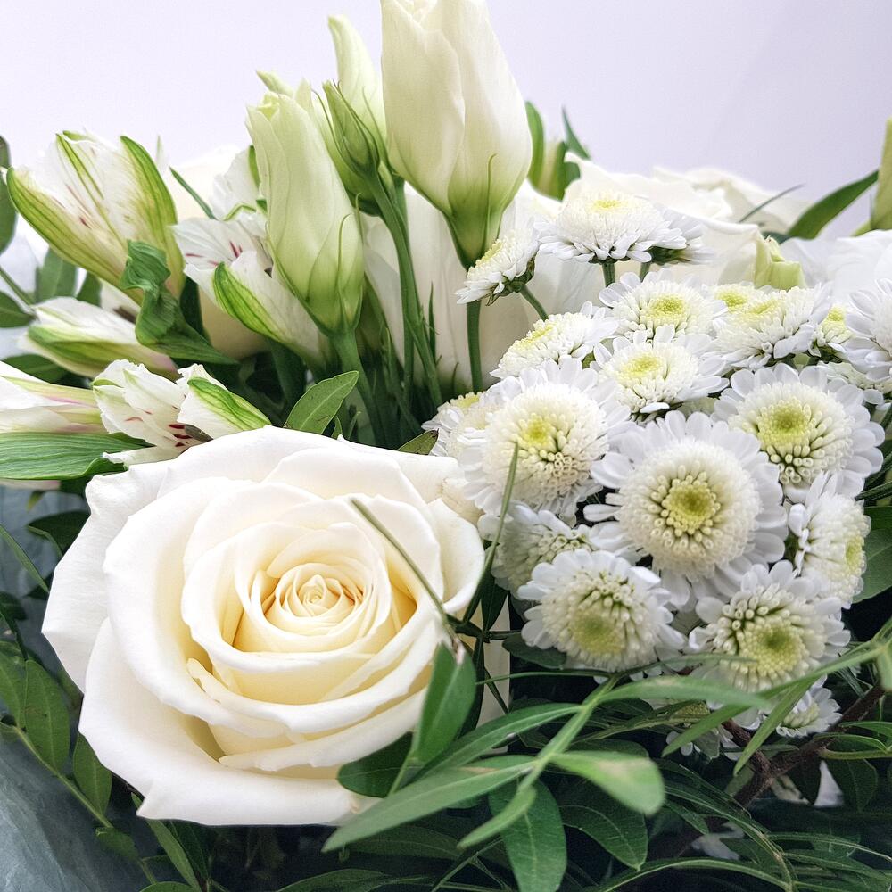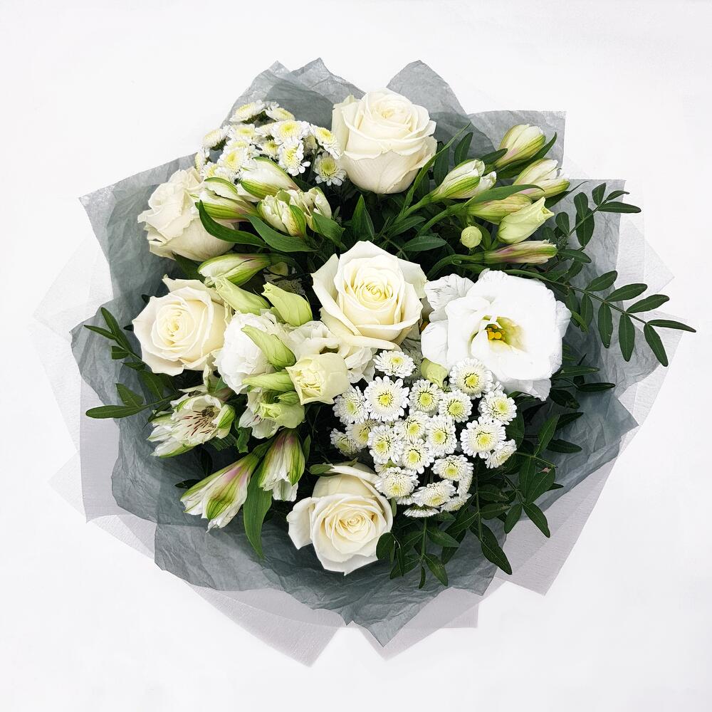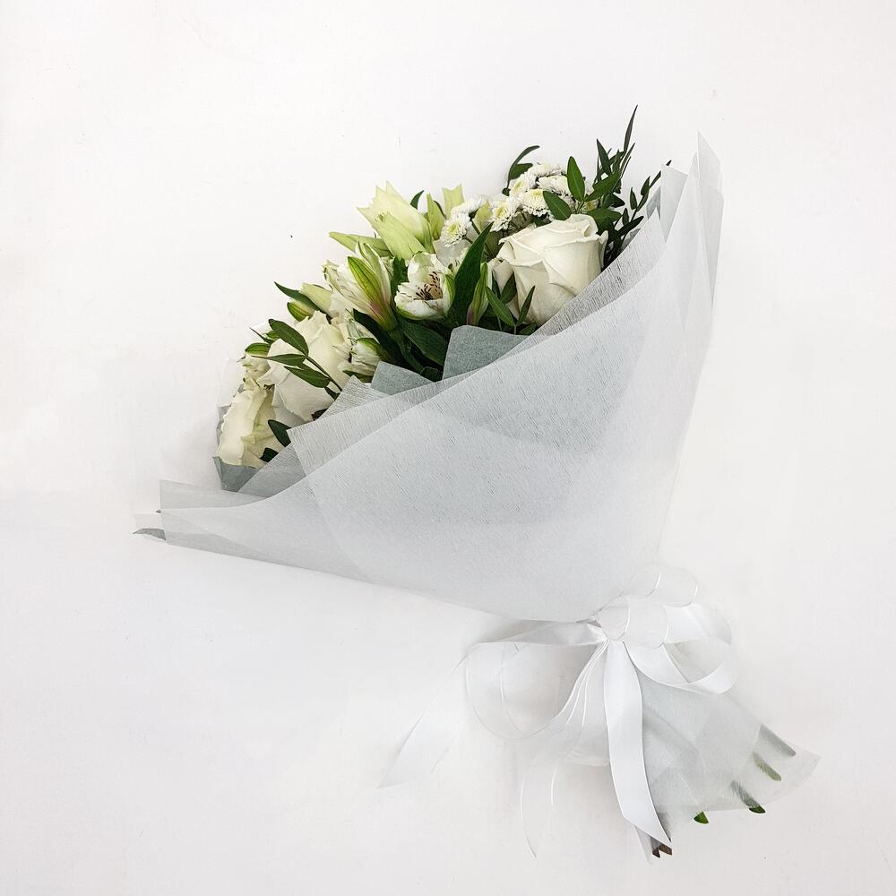 Роза одноголовая белая – 5 шт.Эустома – 2 шт.Альстромерия – 3 шт.Фисташка – 5 шт.Хризантема сталион – 2 шт.Упаковка – 1 шт.