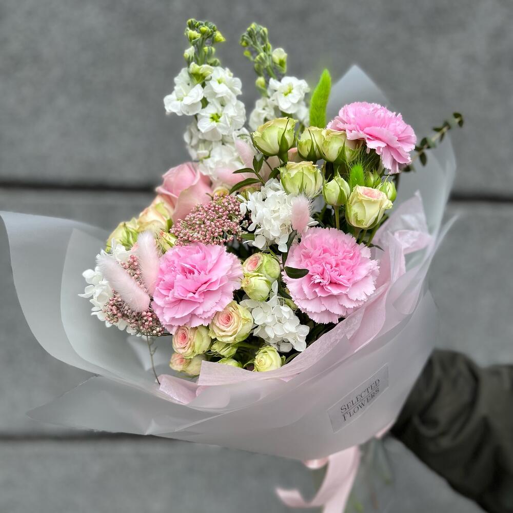 Маттиола – 2 шт.Озотамнус – 2 шт.Роза кустовая – 3 шт.Эвкалипт – 2 шт.Гвоздика – 3 шт.Лагурус – 9 шт.роза кения – 1 шт.