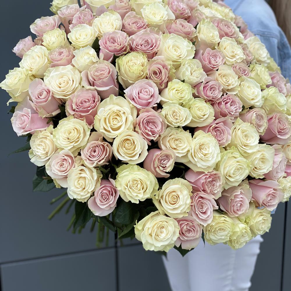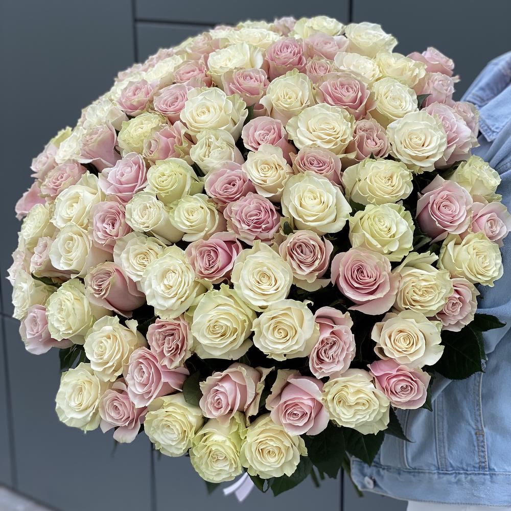 белая роза mondial – 51 шт. розовая роза pink mondial – 50 шт. Лента атласная – 1 шт.