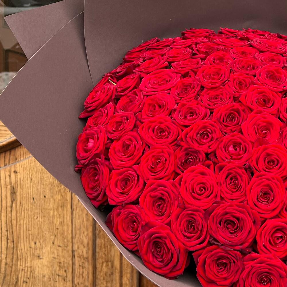 Роза красная 60 см – 101 шт.Дизайнерская упаковка – 3 шт.Лента атласная – 2 шт.