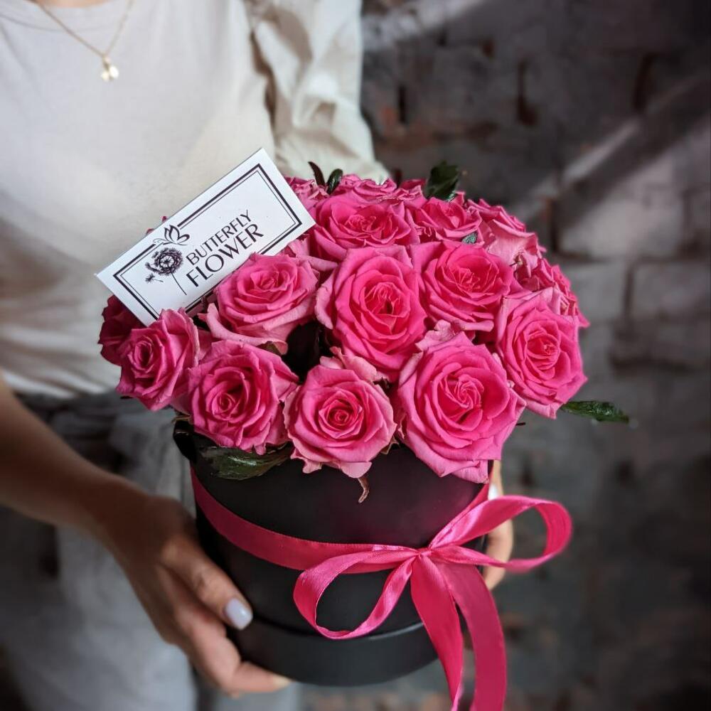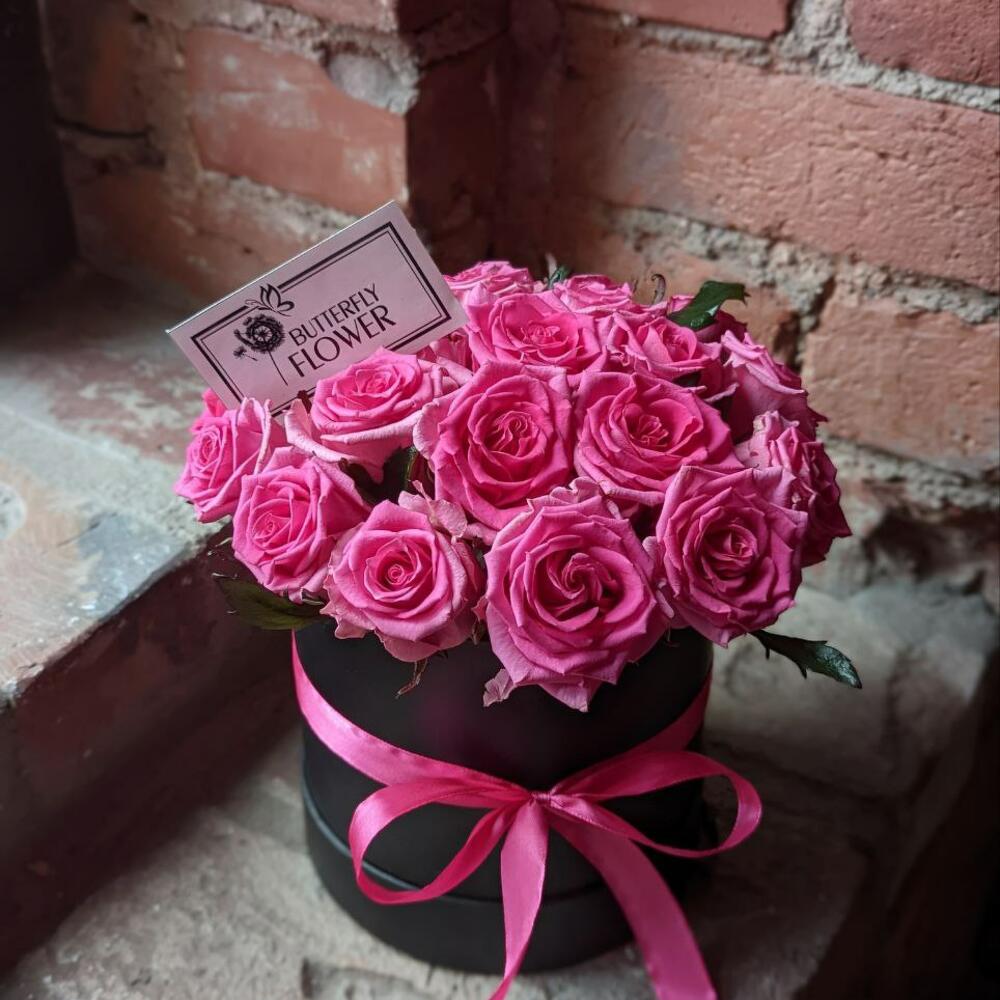 Букет из 21 розы в шляпной коробке “Розовое суфле фуксия”