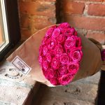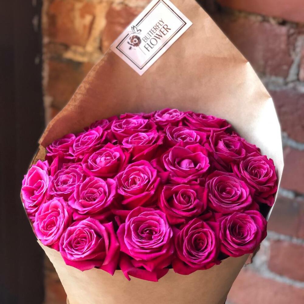 Букет из 25 розовых роз в стильной упаковке “Взрывная фуксия”