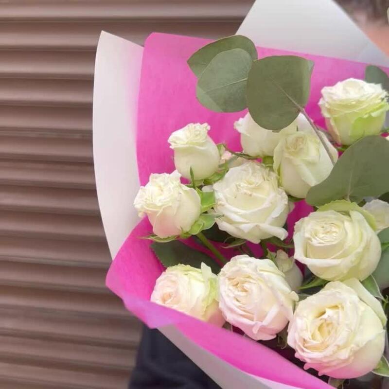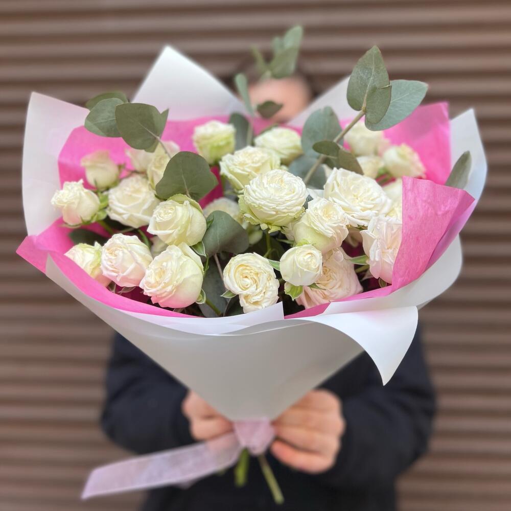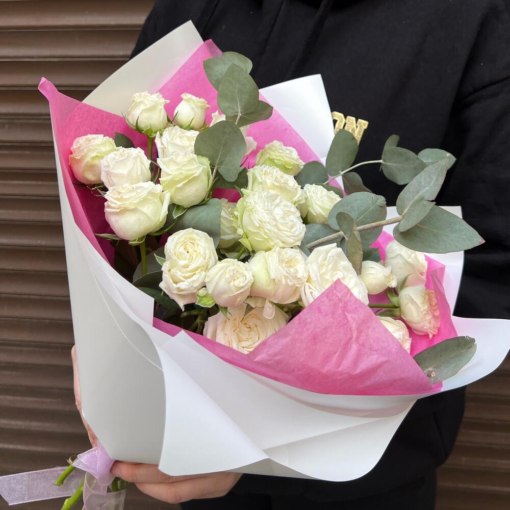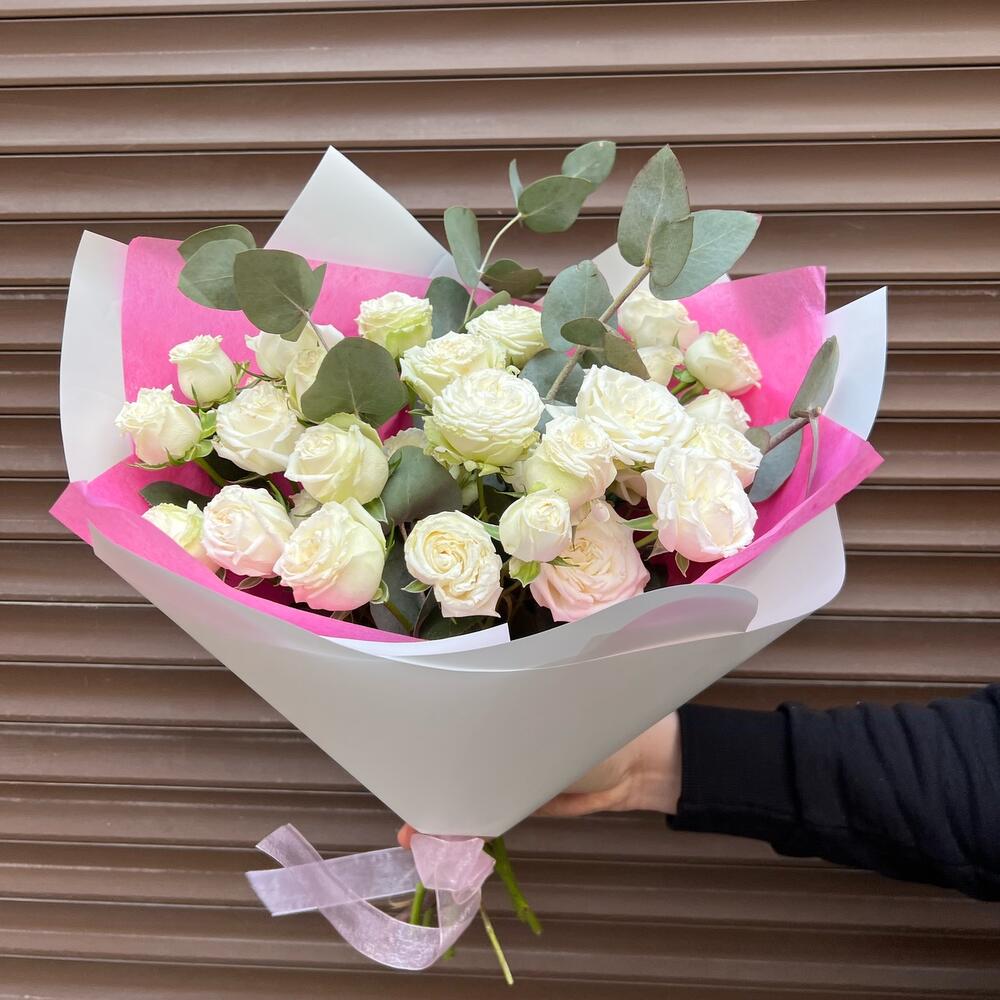 Эвкалипт – 4 шт.Лента атласная – 1 шт.Кустовая роза Бомбастик – 5 шт.Тишью – 1 шт.Пленка матовая – 2 шт.