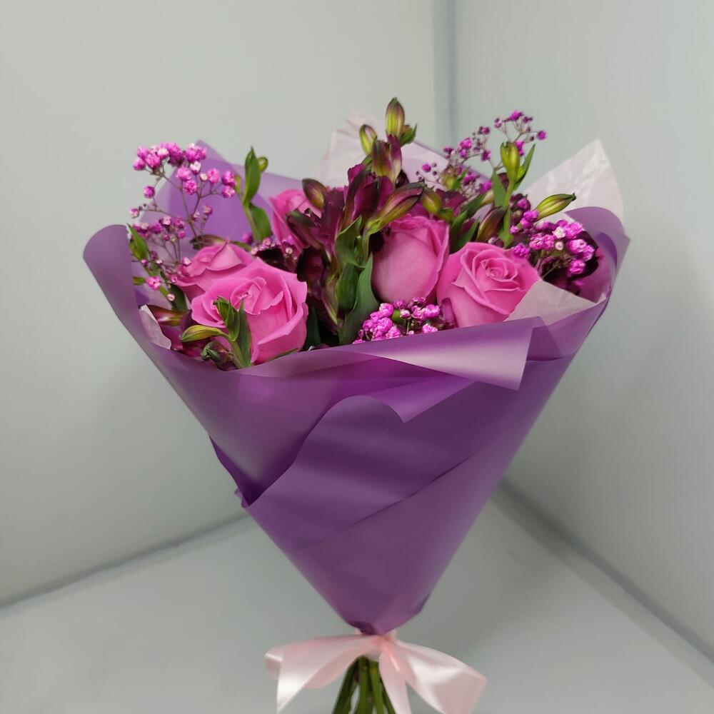 роза кения 40 см – 7 шт.Альстромерия лиловая – 2 шт.Гипсофила розовая – 1 шт.Дизайнерская упаковка – 1 шт.