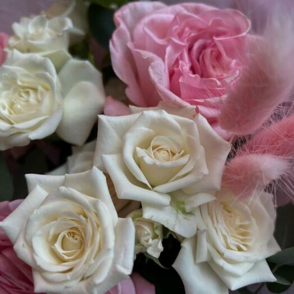 Пионовидная роза – 3 шт.Пионовидная кустовая роза – 2 шт.Эвкалипт – 2 шт.Лагурус – 3 шт.декоративная упаковка – 1 шт.Атласная лента – 1 шт.