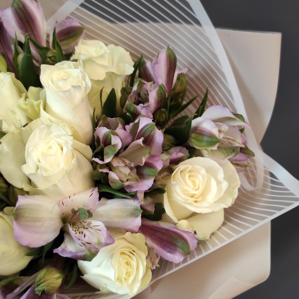 Роза – 7 шт.Альстромерия – 5 шт.Пленка матовая – 2 шт.Лента атласная – 1 шт.