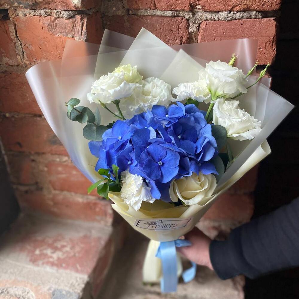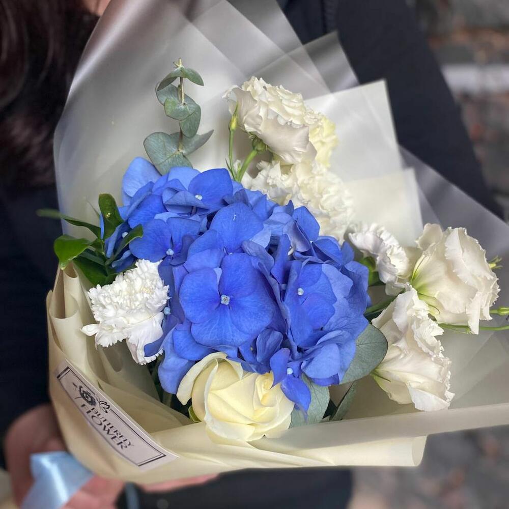Гортензия – 1 шт.Роза белая – 1 шт.Гвоздика – 2 шт.Эустома – 2 шт.Эвкалипт – 2 шт.Упаковка – 2 шт.