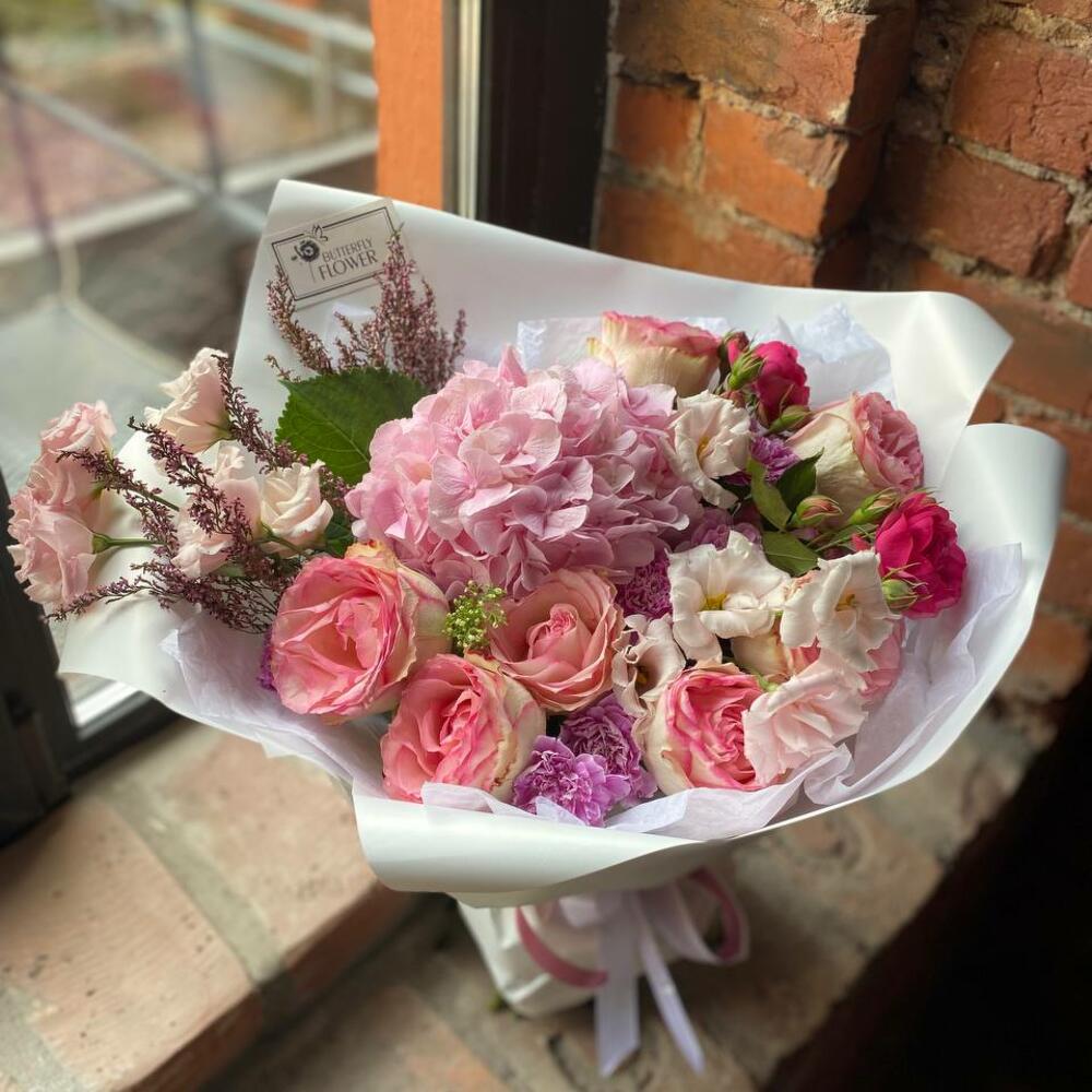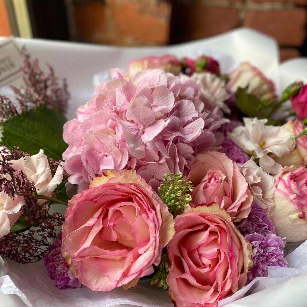 Гортензия – 1 шт.Роза – 8 шт.Эустома – 3 шт.Вереск – 2 шт.Гвоздика – 7 шт.Роза пионовидная кустовая – 2 шт.Седум – 2 шт.Упаковка – 2 шт.