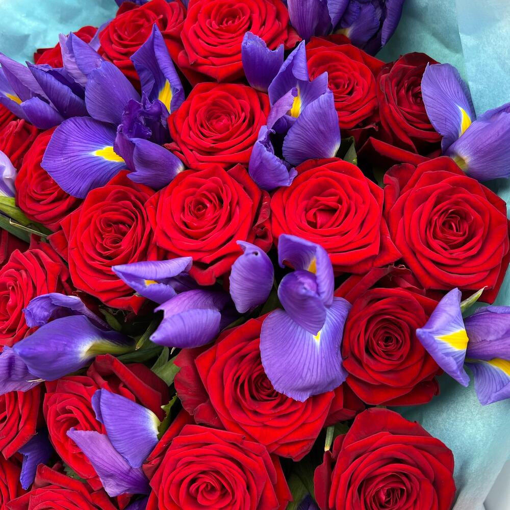Роза красная 60 см – 19 шт.Ирис Blue Magic – 20 шт.Дизайнерская упаковка – 5 шт.Тишью – 1 шт.Лента атласная – 2 шт.