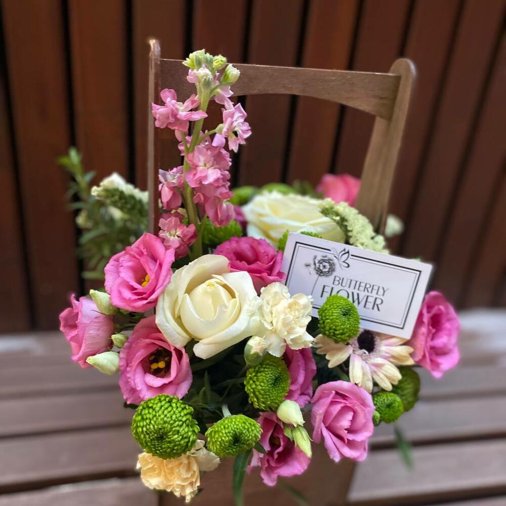 Хризантема кустовая – 3 шт.Маттиола – 1 шт.Роза – 3 шт.Гербера – 1 шт.Эустома – 4 шт.Гвоздика кустовая – 3 шт.Статица – 1 шт.Фисташка – 3 шт.Оазис – 1 шт.Ящик – 1 шт.