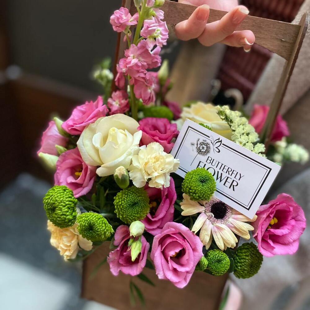 Букет из кустовой хризантемы, гвоздики, роз, маттиолы, статицы, эустомы и зелени в деревянном ящике “Пинк Селин”