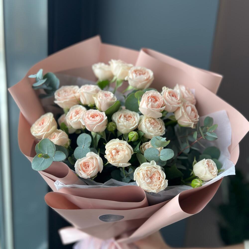 Кустовая пионовидная роза – 5 шт.Эвкалипт – 3 шт.декоративная упаковка – 1 шт.Атласная лента – 1 шт.