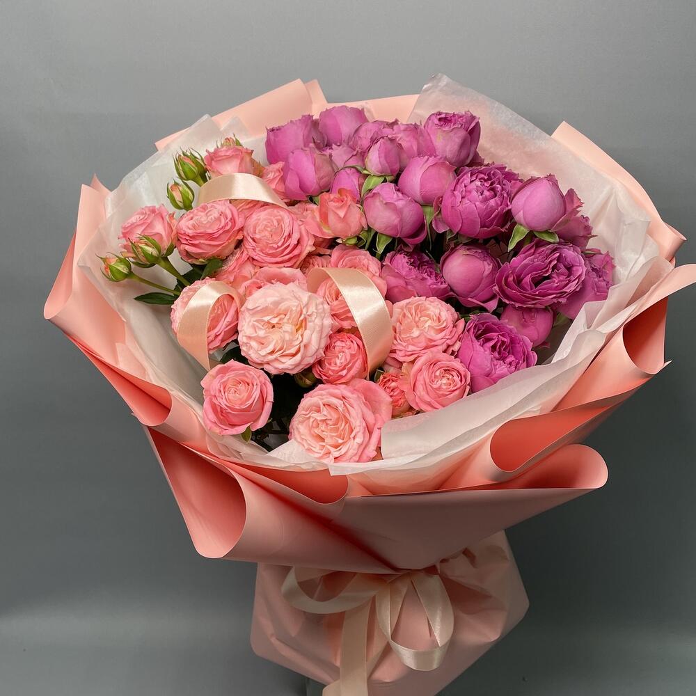 Лента – 2 шт.Роза кустовая пионовидная – 9 шт.Оформление матовая пленка – 7 шт.аквапак с водой – 1 шт.оформление тишью – 4 шт.