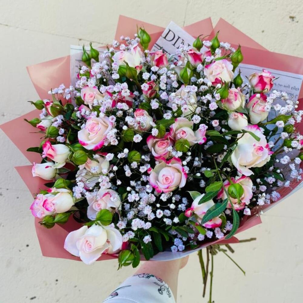 Лента – 1 шт.Роза кустовая – 5 шт.Упаковка – 1 шт.Гипсофила розовая – 1 шт.зелень декоративная – 2 шт.