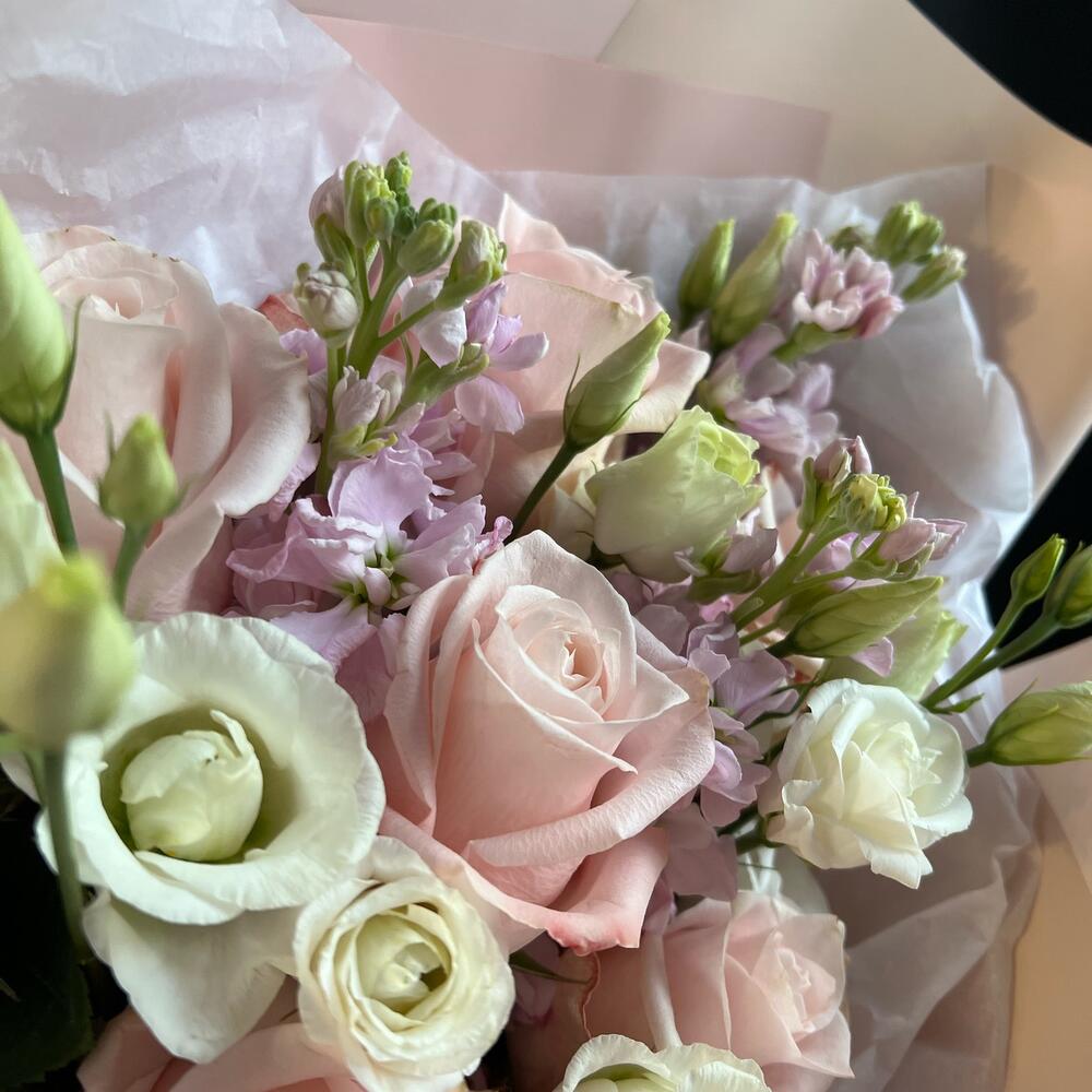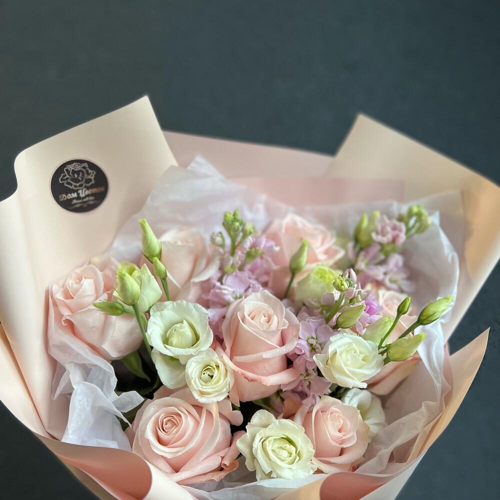 Маттиола – 3 шт.Эустома – 3 шт.Роза – 7 шт.декоративная упаковка – 1 шт.Атласная лента – 1 шт.