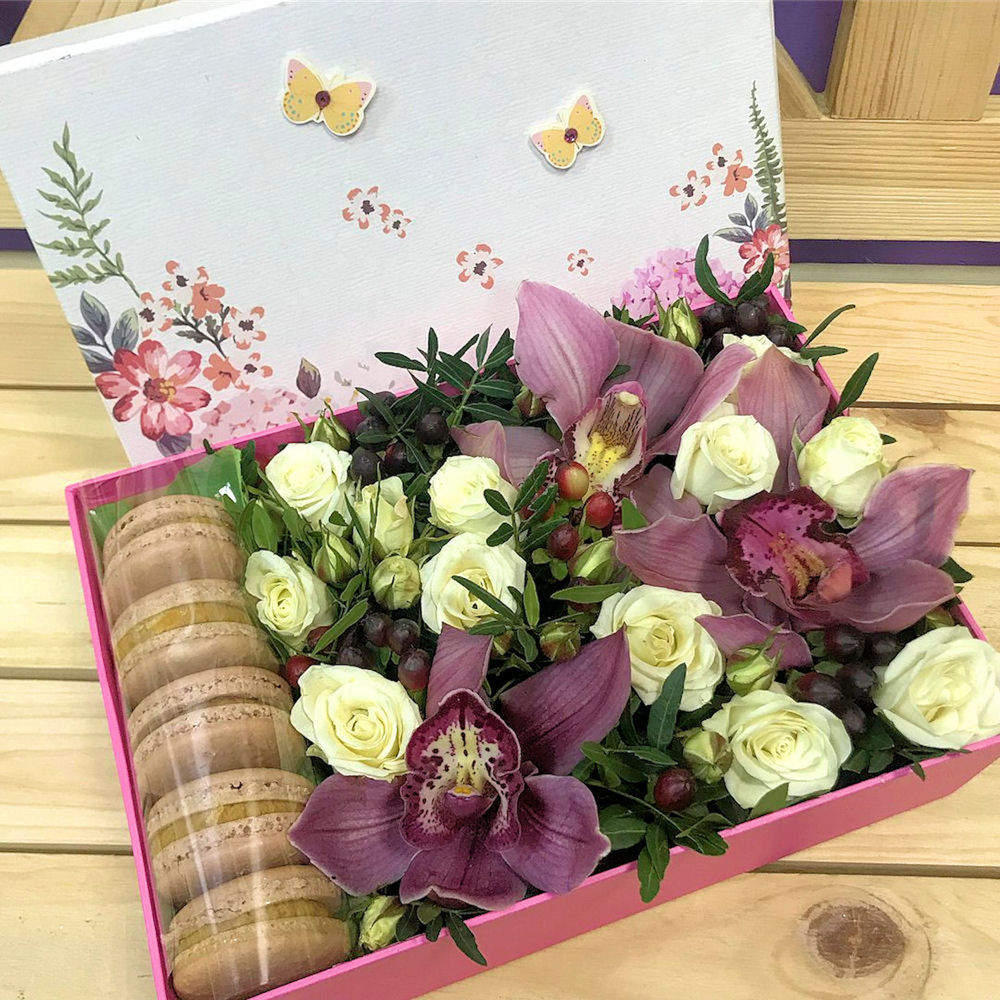 Букет из орхидеи, кустовых роз и макаронс в декоративной коробке "Лучи заката"