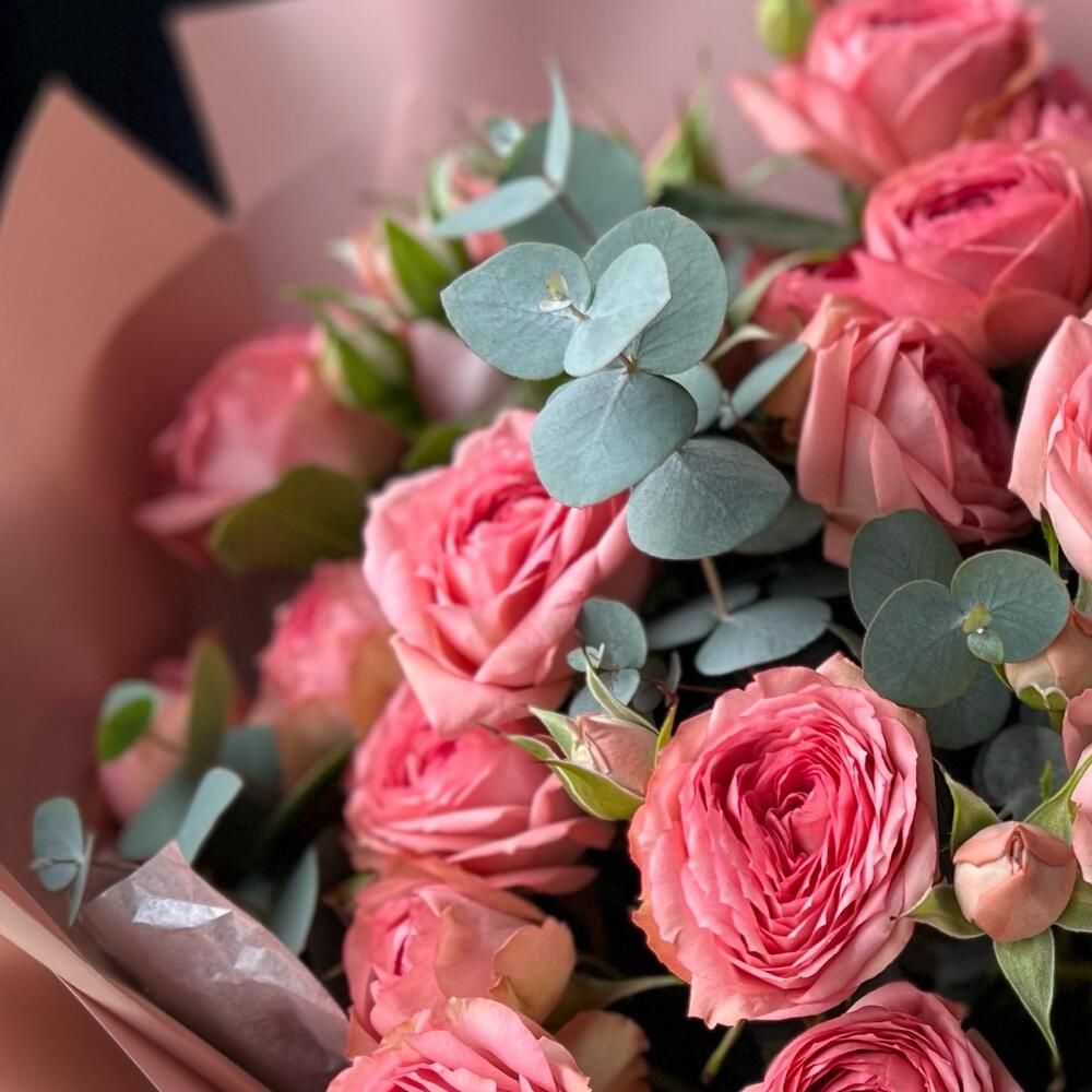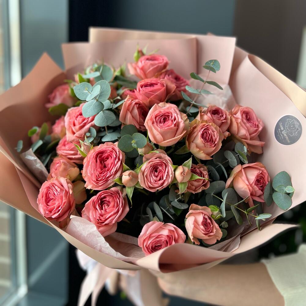 Кустовая пионовидная роза – 5 шт.Эвкалипт – 3 шт.декоративная упаковка – 1 шт.Атласная лента – 1 шт.
