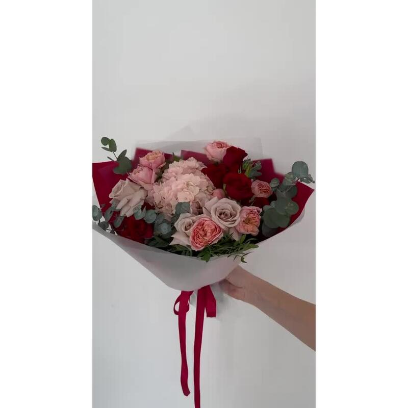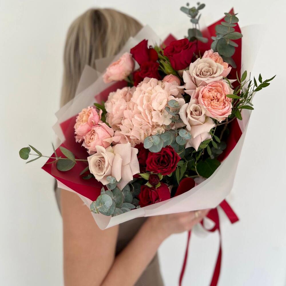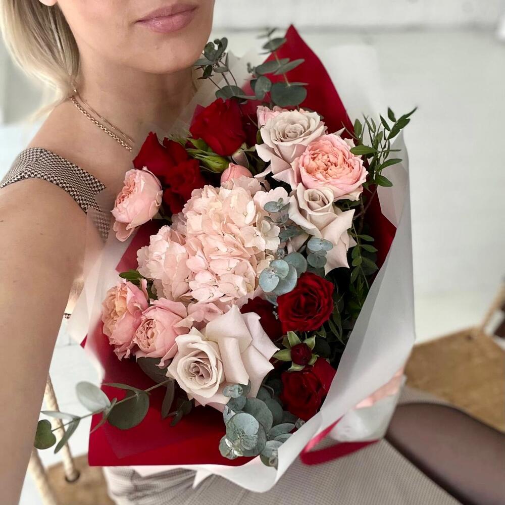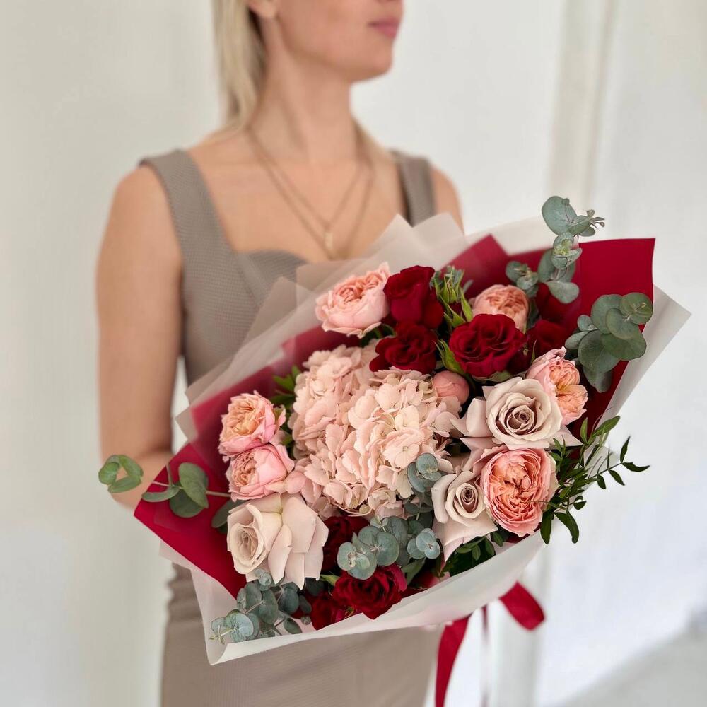 Гортензия – 1 шт.Роза кустовая – 2 шт.Эвкалипт – 3 шт.Роза – 3 шт.Фисташка – 3 шт.Упаковка дизайнерская – 3 шт.Пионовидная кустовая роза – 2 шт.