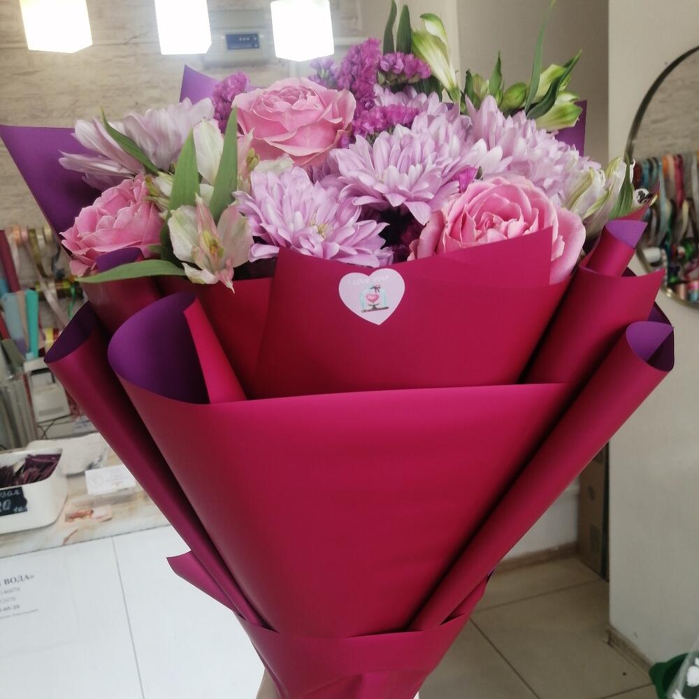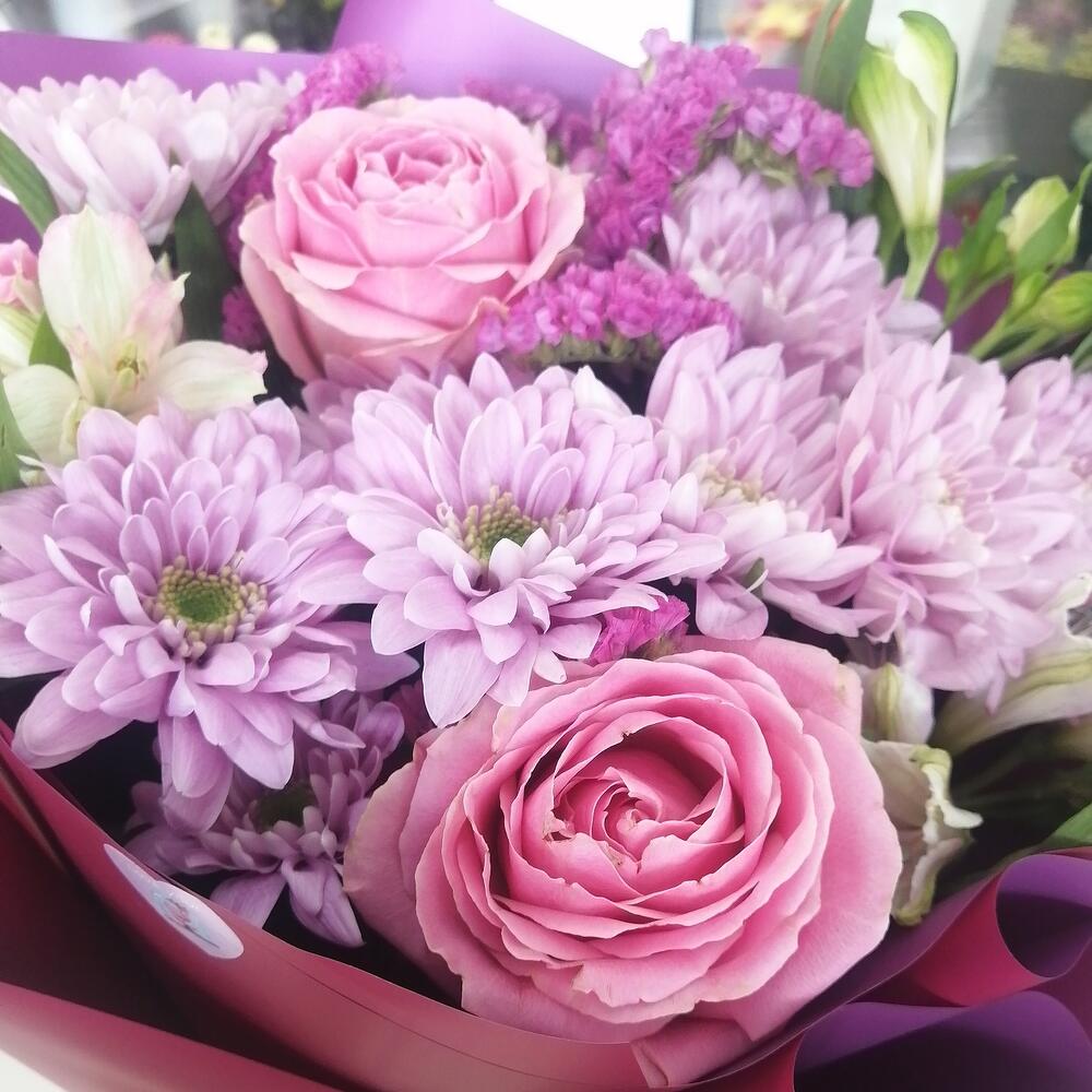 Альстромерия – 3 шт.Статица – 1 шт.Хризантема кустовая – 3 шт.Роза – 3 шт.Упаковка – 1 шт.