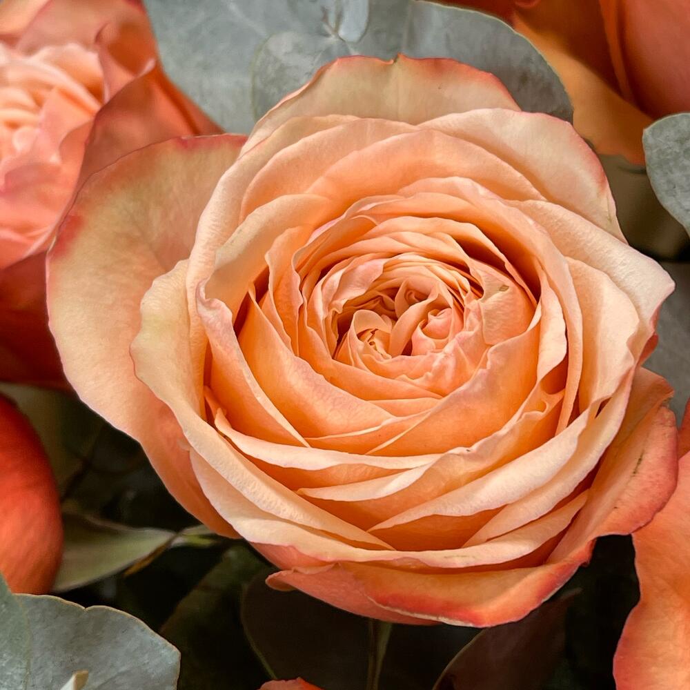 Лента – 1 шт.Эвкалипт – 3 шт.Роза одноголовая – 15 шт.Упаковка дизайнерская – 1 шт.