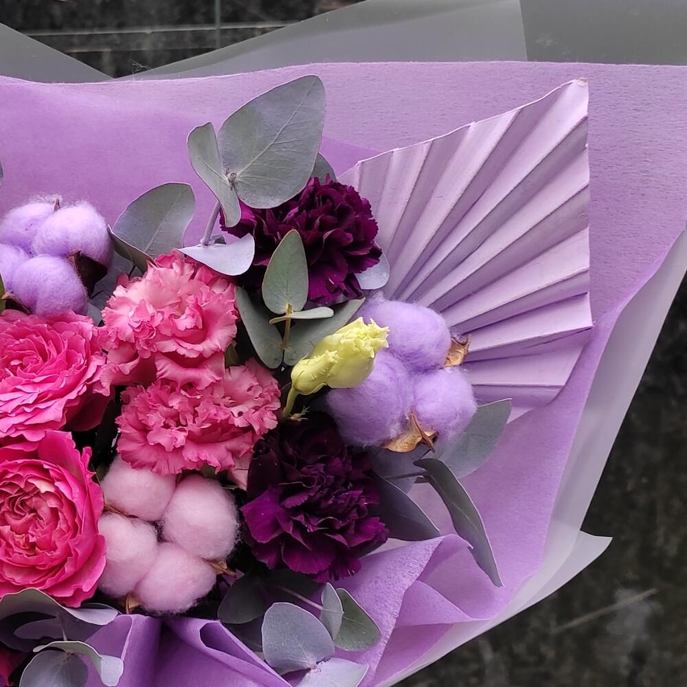 Роза кустовая пионовидная – 1 шт.Лизиантус – 1 шт.Диантус – 2 шт.Хлопок – 6 шт.Пальма – 1 шт.Эвкалипт – 1 шт.Лента – 2 шт.Упаковка дизайнерская – 2 шт.