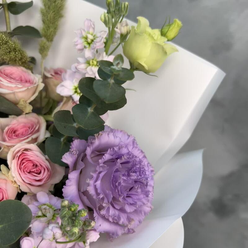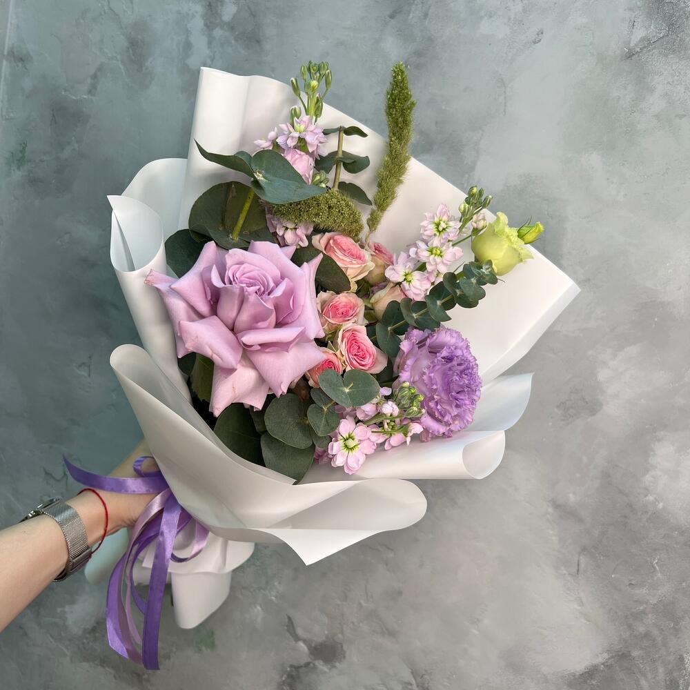 Букет комплимент с ароматной матиолой,французской розой,лизиантус(эустома),эвкалипт