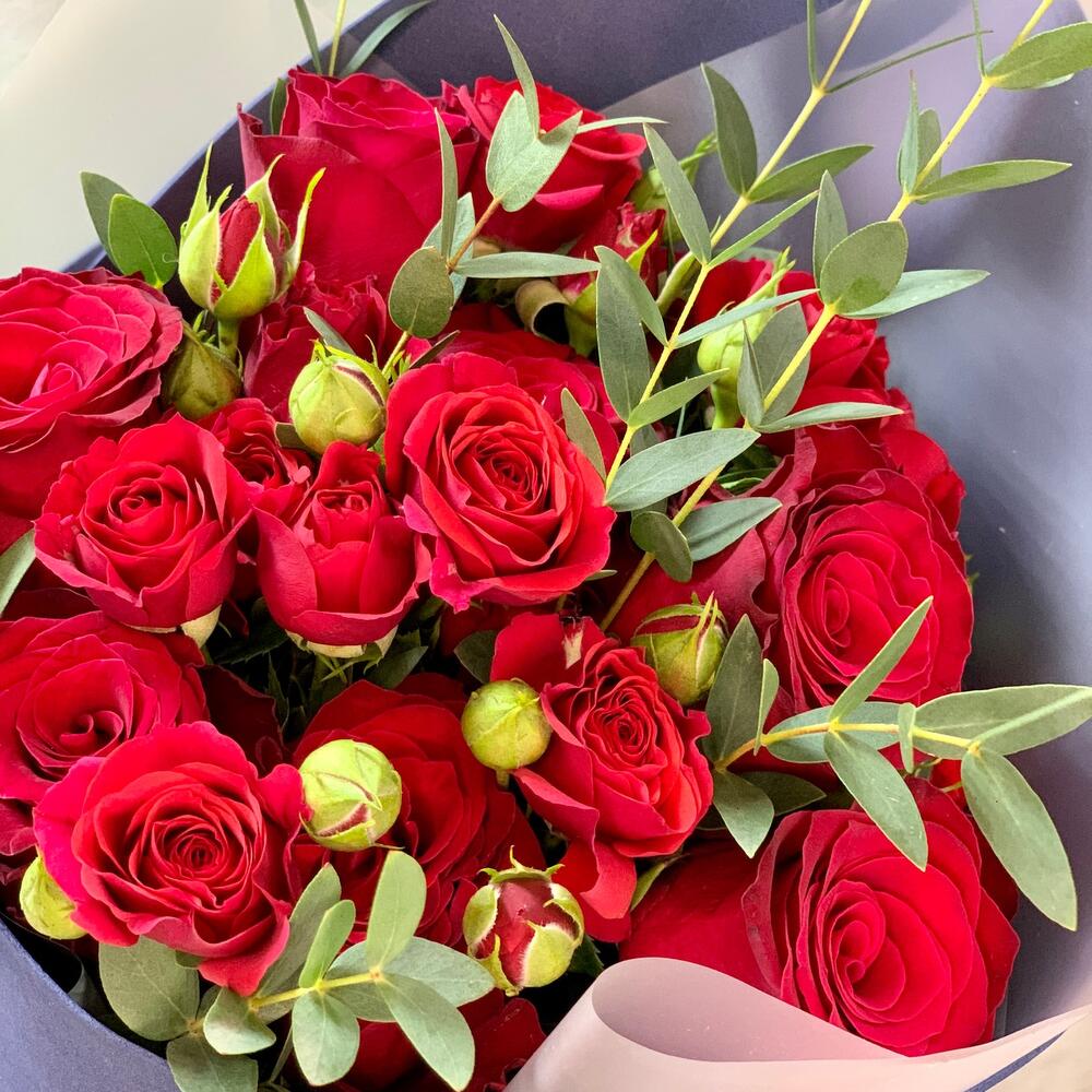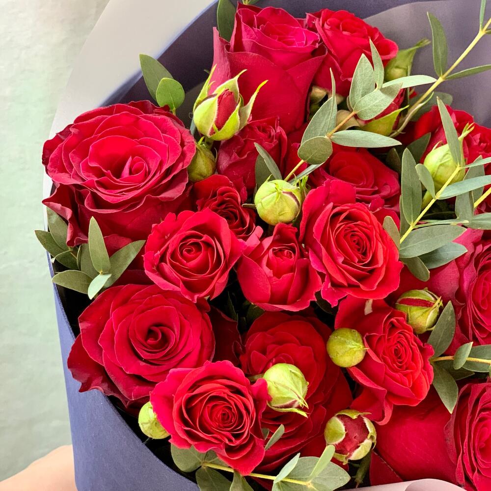 Букет кулек из красных роз и эвкалипта