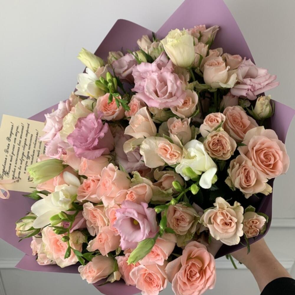 Роза кустовая 40 см – 13 шт.Лизиантус – 3 шт.Фрезия – 3 шт.Матовая пленка – 1 шт.Лента – 1 шт.Кризал – 1 шт.