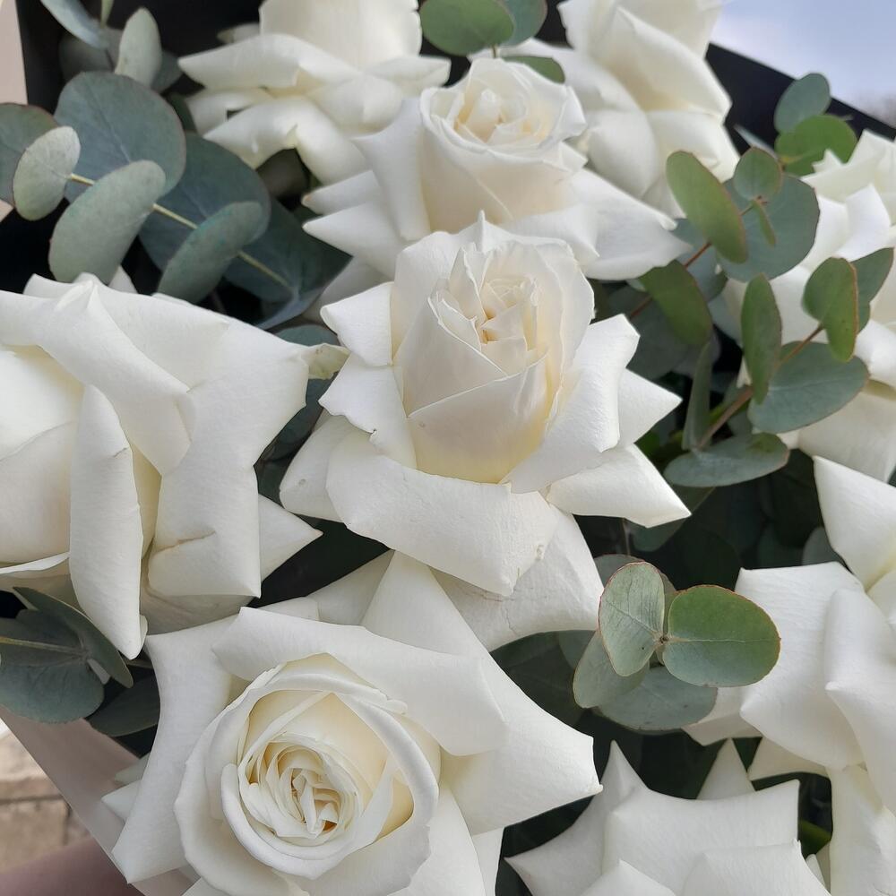 Эвкалипт – 6 шт.Лента атласная – 3 шт.Упаковка дизайнерская – 4 шт.Роза французская – 13 шт.