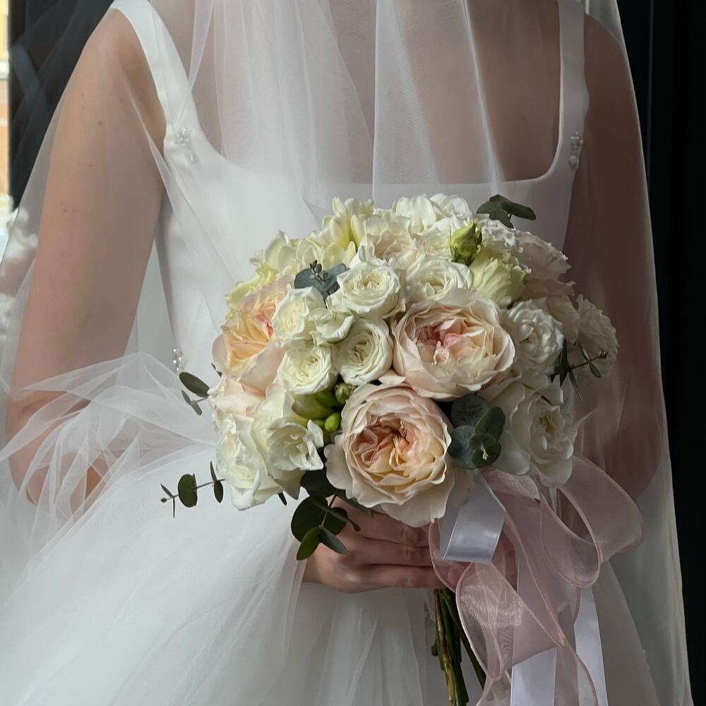 Лизиантус – 3 шт.Фрезия – 5 шт.Эвкалипт – 3 шт.Пионовидная роза – 7 шт.Атласная лента – 3 шт.Кустовая пионовидная роза – 6 шт.