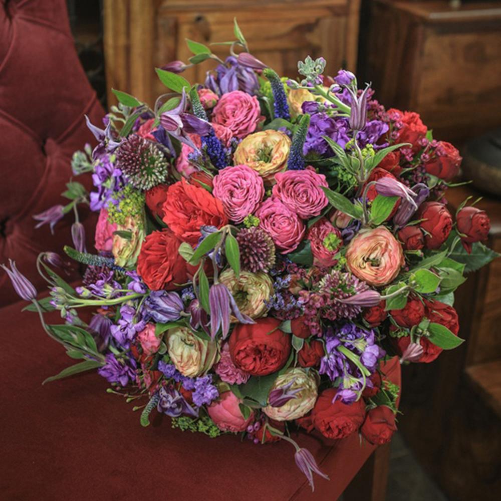 Аллиум – 5 шт.Ваксфлауэр – 5 шт.Вероника – 10 шт.Клематис – 7 шт.Лимониум – 2 шт.Маттиола – 5 шт.Роза кустовая пионовидная – 20 шт.Роза пионовидная – 9 шт.Салал – 1 шт.Статица – 3 шт.Лента – 1 шт.