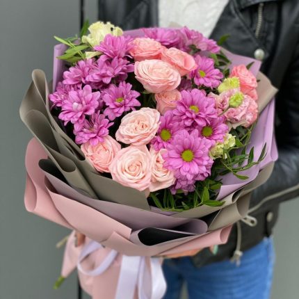 Эустома – 3 шт. Хризантема момоко – 3 шт. Озотамнус – 2 шт. Кустовая пионовидная роза – 3 шт. Кустовая роза Бомбастик – 3 шт. Оформление – 1 шт.
